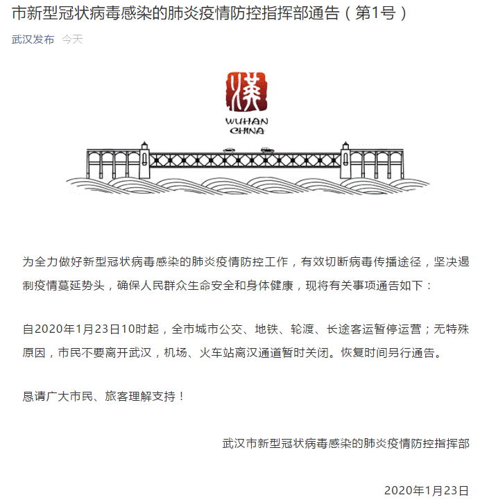 自2020年1月23日10時起,全市城市公交、地鐵、輪渡、長途客運暫停運營;無特殊原因,市民不要離開武漢,機場、火車站離漢通道暫時關閉。恢復時間另行通告。