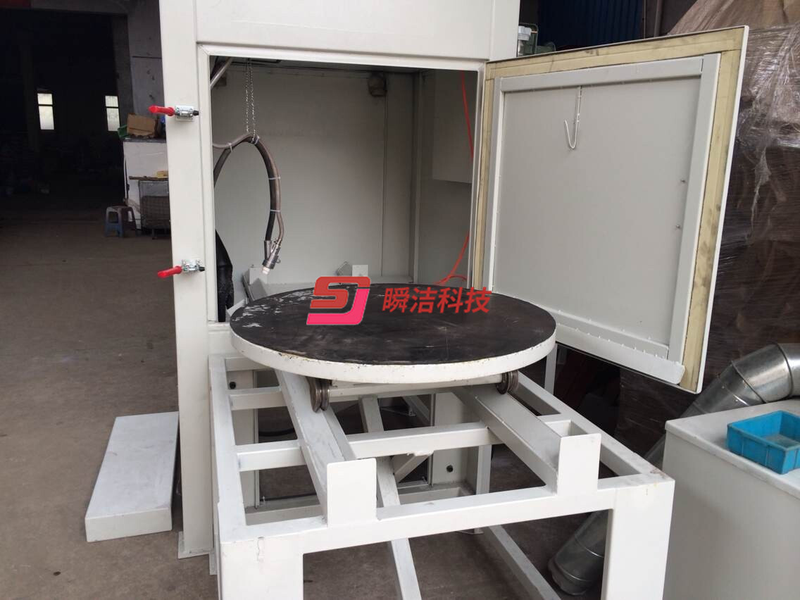 3、配備活動臺車,和轉盤,操作時將工件放在轉盤上,然后推入機內即可噴砂作業,操作簡單省力。