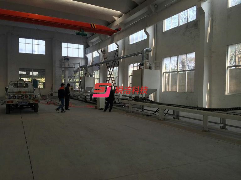小口徑的鋼管使用內壁噴丸機,鋼管內壁噴丸處理線,主要包括移動臺車,砂斗,噴砂罐,噴槍,噴槍承載車,鋼管承載系統,底部彈丸輸送皮帶機,斗提機,維修平臺,分離器,除塵系統,支架,氣動系統,壓縮空氣系統,電控系統。